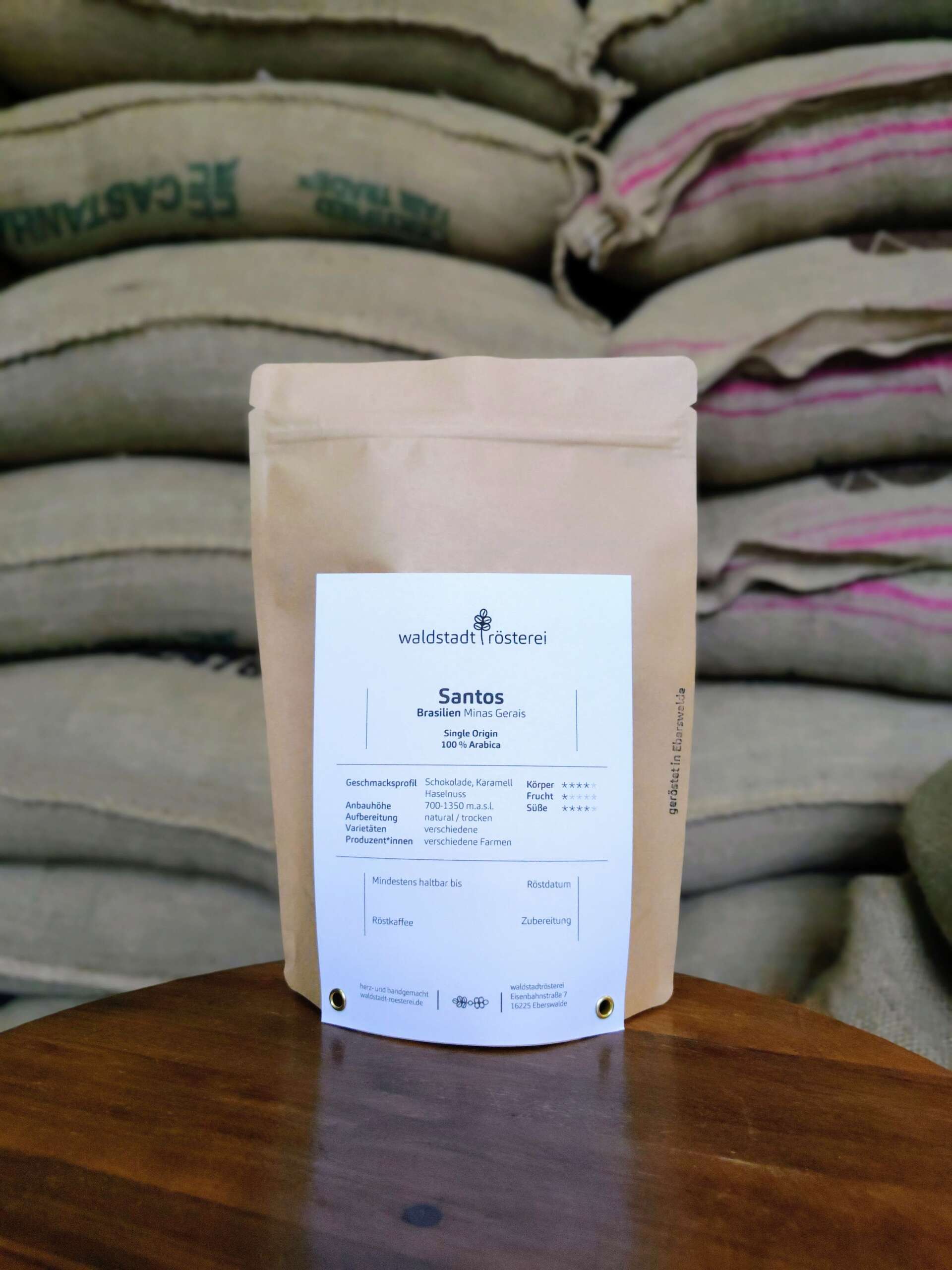 Santos stellt mit seinen süßen Nuss- und Schokoladenaromen und viel Körper wieder ein klassisches brasilianisches Geschmacksprofil aus Minas Gerais dar. Die hohe Anbaulage, die Böden vulkanischen Ursprungs und das Mikroklima in der Region sind ideal für den Kaffeeanbau und bringen besonders ausgewogene Kaffees hervor. Das warme Klima ist optimal für die trockene Aufbereitung. Dafür trocknen die geernteten Kaffeekirschen in der Sonne ehe das Fruchtfleisch mechanisch entfernt wird. Durch die trockene Aufbereitung gewinnt der Kaffee vor allem an Süße aus der Kaffeefrucht.